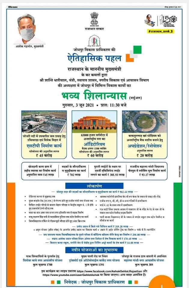 मुख्यमंत्री अशोक गहलोत द्वारा जोधपुर विकास प्राधिकरण के माध्यम से जोधपुर में कराए जा रहे 27 विकास कार्यों एवं योजनाओं का वर्चुअल लोकार्पण, शिलान्यास और शुभारम्भ किया गया. केंद्रीय जलशक्ति मंत्री और जोधपुर से सांसद गजेंद्र सिंह शेखावत ने मुख्यमंत्री गहलोत के जोधपुर में शिलान्यास कार्यक्रम को प्रोपेगेंडा प्रोग्राम करार दिया है. शेखावत ने कटाक्ष किया कि मुख्यमंत्री जी, आपके शिलान्यास प्रोपेगेंडा प्रोग्राम से तय हो गया कि राजस्थान में जनता और सरकार के लिए अलग-अलग नियम हैं. जैसे अंग्रेजी राज में हुआ करते थे.